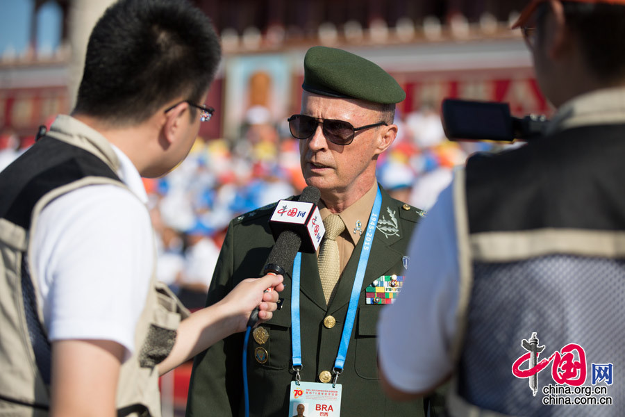 9月3日,中國人民抗日戰爭暨世界反法西斯戰爭勝利70周年紀念大會將在北京隆重舉行。圖為中國網記者王一辰、齊凱在活動現場采訪。中國網記者 鄭亮攝影