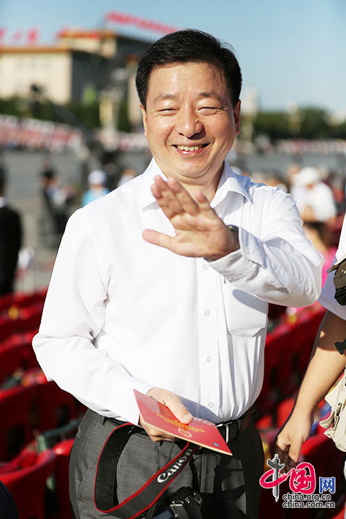9月3日,中國人民抗日戰(zhàn)爭暨世界反法西斯戰(zhàn)爭勝利70周年紀(jì)念大會即將開始,嘉賓陸續(xù)到達(dá)。圖為中國外文局局長周明偉抵達(dá)現(xiàn)場。中國網(wǎng)記者 鄭亮 攝