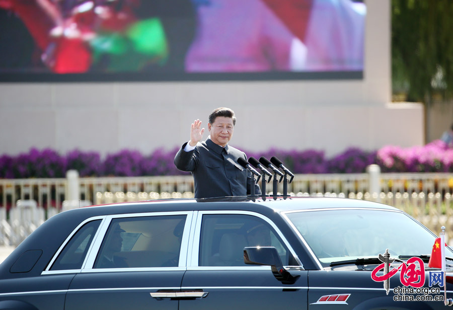 9月3日,中共中央總書記、國家主席、中央軍委主席習近平,乘紅旗牌檢閱車,開始檢閱受閱部隊。中國網記者 鄭亮攝影