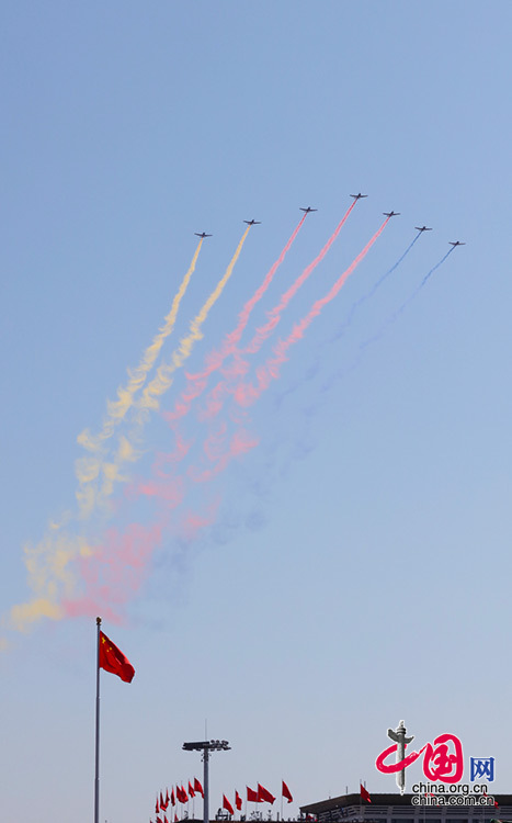 9月3日,中國人民抗日戰爭暨世界反法西斯戰爭勝利70周年紀念大會在北京隆重舉行。圖為空中護旗方隊接受檢閱。中國網記者 董寧 攝