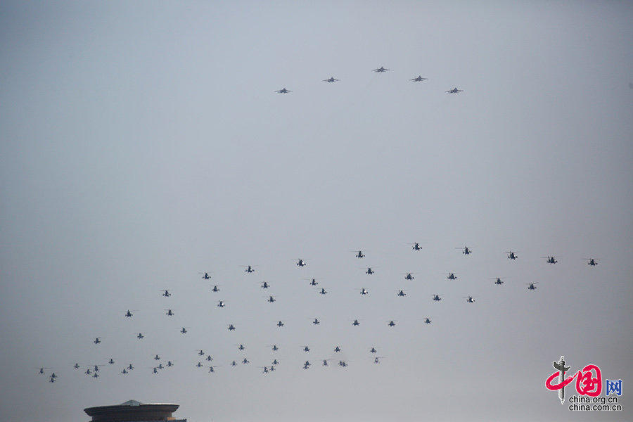 9月3日,中國人民抗日戰爭暨世界反法西斯戰爭勝利70周年紀念大會在北京隆重舉行。圖為艦載機梯隊接受檢閱。中國網記者 楊佳 攝