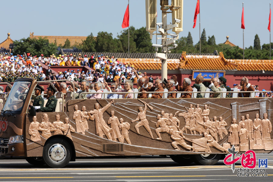9月3日,中國人民抗日戰(zhàn)爭暨世界反法西斯戰(zhàn)爭勝利70周年紀念大會在北京隆重舉行。抗戰(zhàn)支前模范乘車方隊隊。 中國網(wǎng)記者 董寧攝影