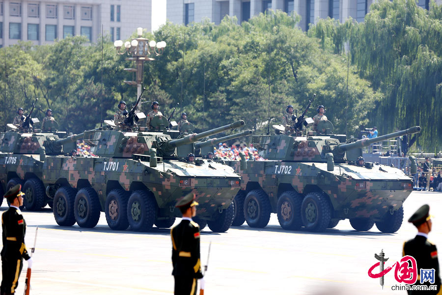 9月3日,中國人民抗日戰(zhàn)爭暨世界反法西斯戰(zhàn)爭勝利70周年紀念大會在北京隆重舉行。輪式裝甲突擊車方隊接受檢閱。