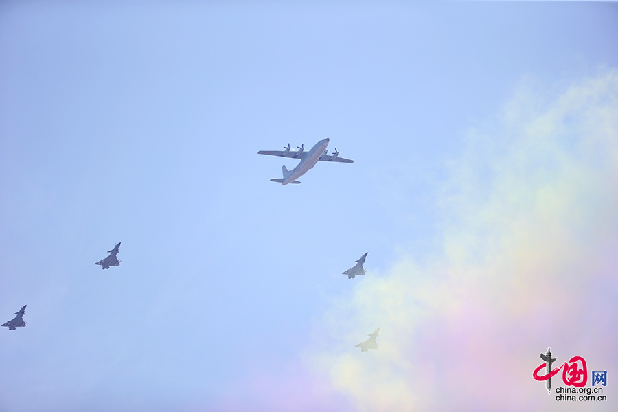 9月3日,中國(guó)人民抗日戰(zhàn)爭(zhēng)暨世界反法西斯戰(zhàn)爭(zhēng)勝利70周年紀(jì)念大會(huì)在北京隆重舉行。圖為預(yù)警指揮機(jī)梯隊(duì)接受檢閱。中國(guó)網(wǎng)記者 鄭亮 攝