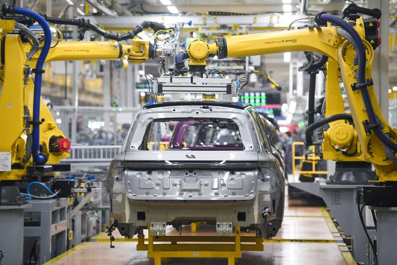 理想汽車常州基地的機器人在安裝車窗玻璃。新華社記者 李博 攝